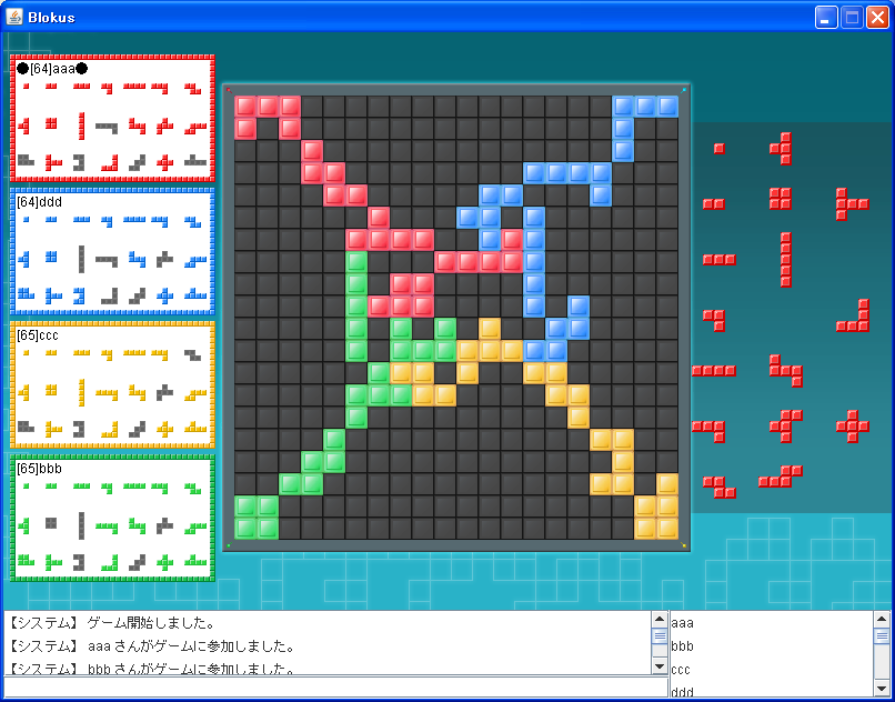 http://xxx.xxxxxxxx.jp/blokus/Blokus0.0.3.zip リンクをクリックすると403エラーとなってしまうため、アドレスバーに直接入力してダウンロードしていただきたい。 残りタスク ・ゲームモード(4人戦、2人戦)をサーバの設定値を取得orゲームごとに指定するように ・ゲーム途中で切断された場合のリセット これができたらメジャーバージョンあげようかなー。 (追記) 友人にプレイしてもらった所、結構致命的なバグがあったので修正。0.0.3になりました。